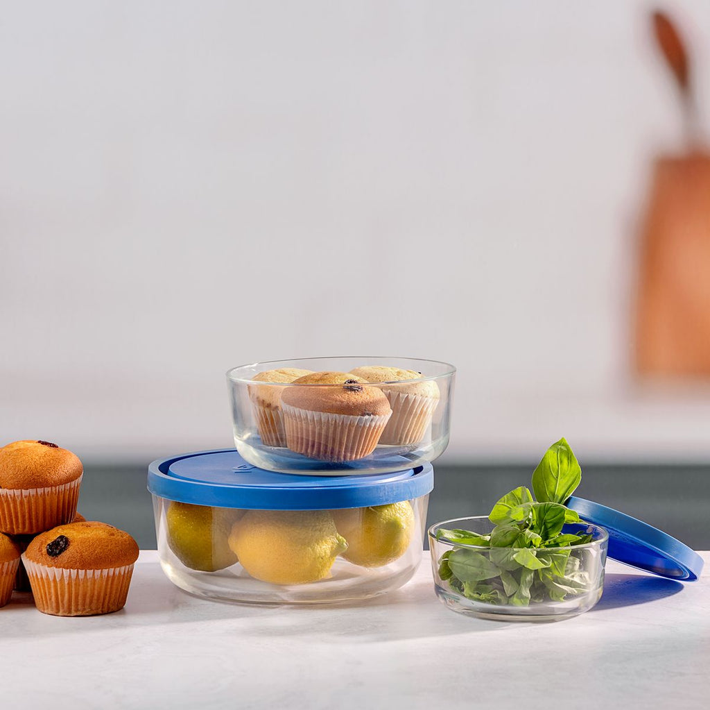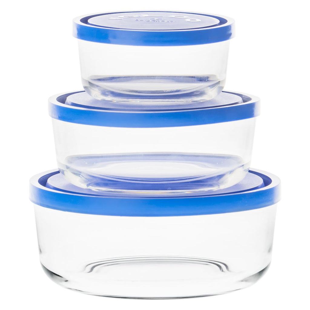 Each container features a durable, clear glass body and a secure blue lid, making them ideal for everyday use.