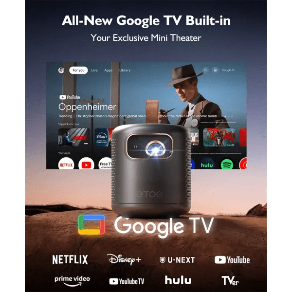 Experience cinema-quality entertainment anywhere with the ETOE Dolphin Google TV Projector. This compact, can-sized projector delivers stunning Full HD visuals and immersive Dolby Audio, making it perfect for home movie nights, outdoor gatherings, or business presentations. With built-in Google TV, access over 8,000 apps, including Netflix, YouTube, and TikTok, all controlled effortlessly via voice commands.