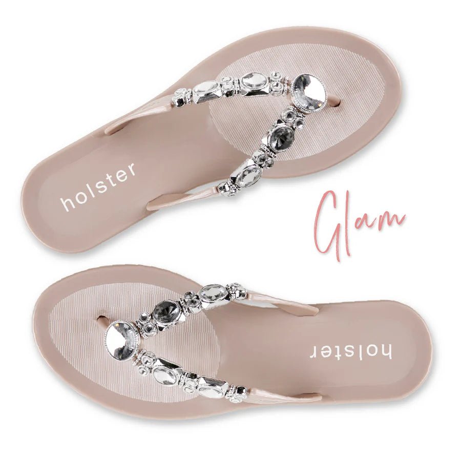 Dress to impress in holster's jewelled, vegan jelly Y-strap, Glam. Covered in 34 sparkling jewels, Glam's contoured insoles, air-pocket heels and beautifully embellished uppers will shimmer and shine every step of the way.