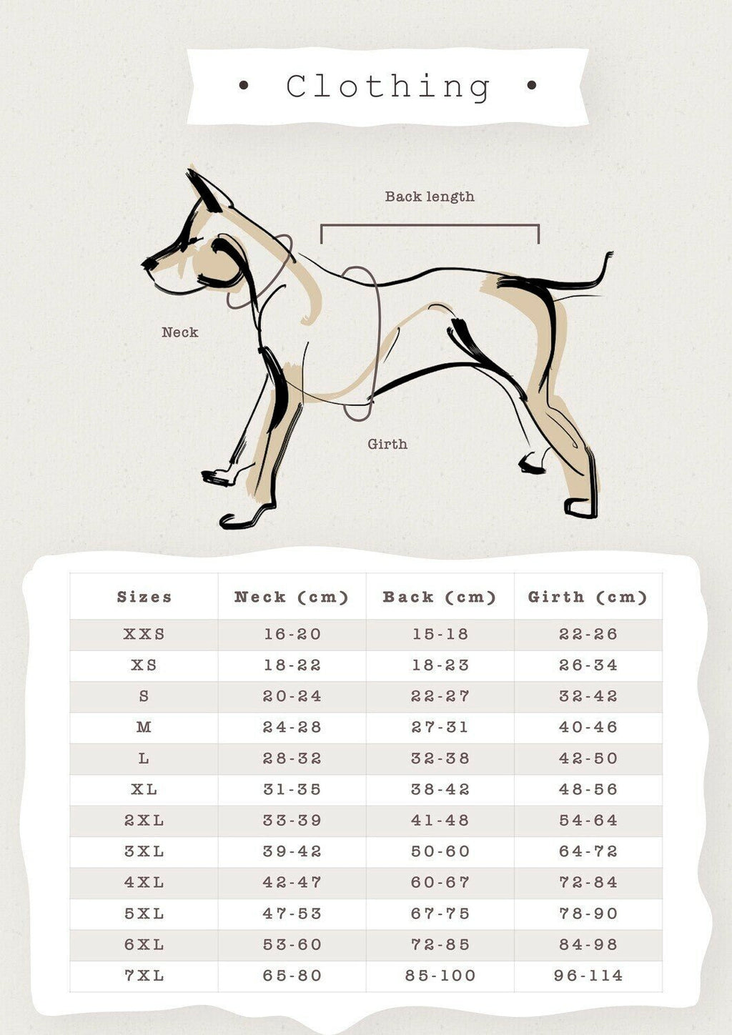 - S: Neck 20-24, Girth 32-42, back 22