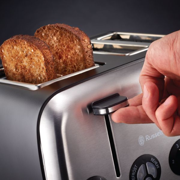 This Russell Hobbs Toaster is durable and functional. The black housing has been brushed for an appealing matte finish. The toaster is a 4-slice toaster, and it’s powered at 1750 watts. The toaster operates on 6 adjustable heat settings to control the desired browning of the toast. There are three additional functions on the side of the toaster, which include defrost, reheat, and cancel. The defrost setting is utilised for frozen bread, the reheat option allows for cold toast to be reheated, and the cancel option may be utilised during operation.